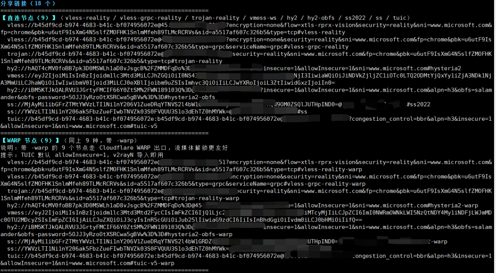 一键安装sing-box脚本,开箱即用 18 个节点(直连 9 + WARP 9),含端口一键切换、BBR 加速、分享链接导出等。支持系统:Debian 11+ / Ubuntu 20.04+ / CentOS Stream 9+ / Rocky 9+ / AlmaLinux 9+ / Fedora 38+ / Arch(rolling) / openSUSE Leap 15.4+,已在Vultr 上测试通过。脚本地址:Alvin9999/Sing-Box-Plus