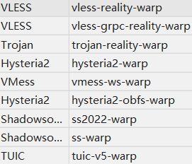 WARP 9:(同上 9 种,出站经 Cloudflare WARP)